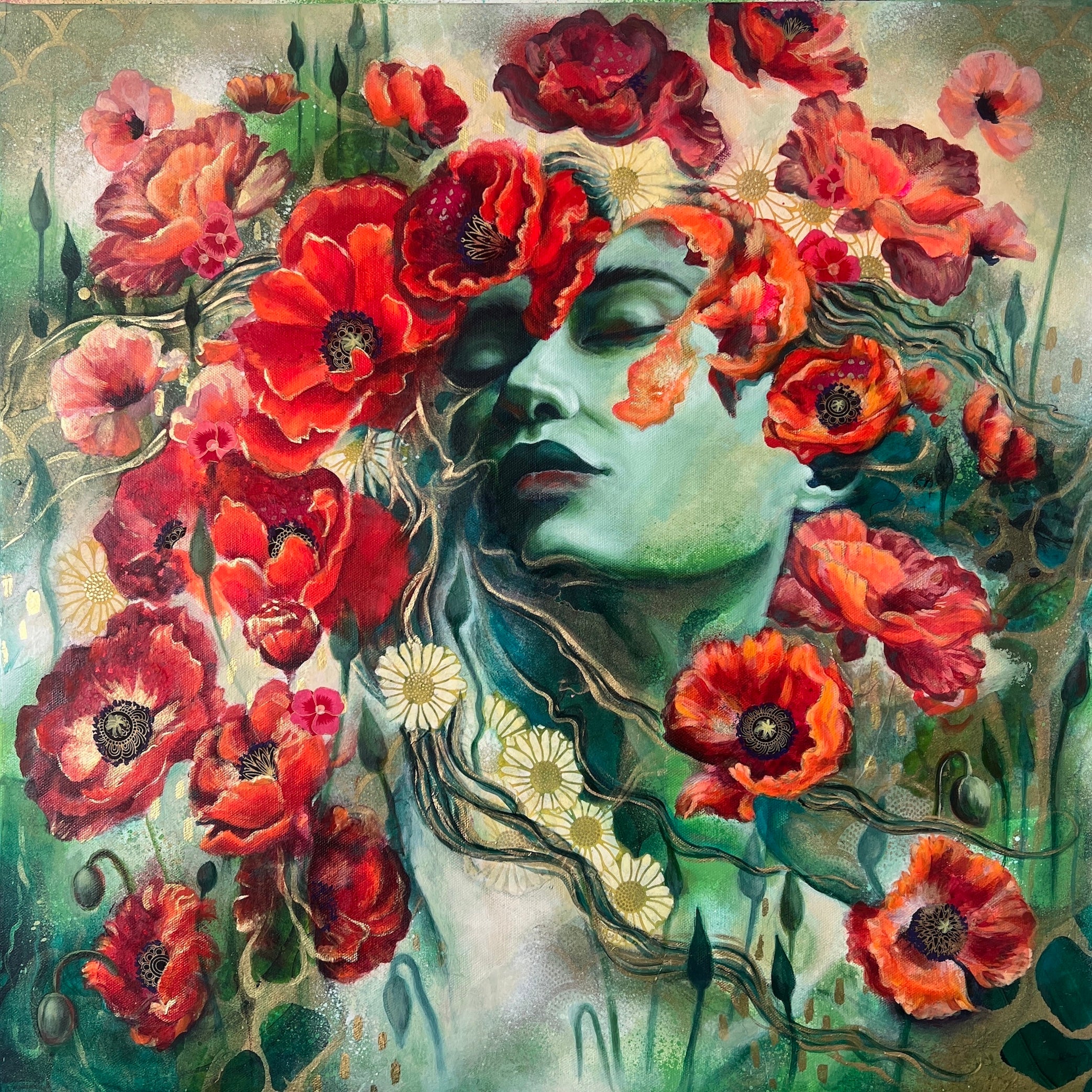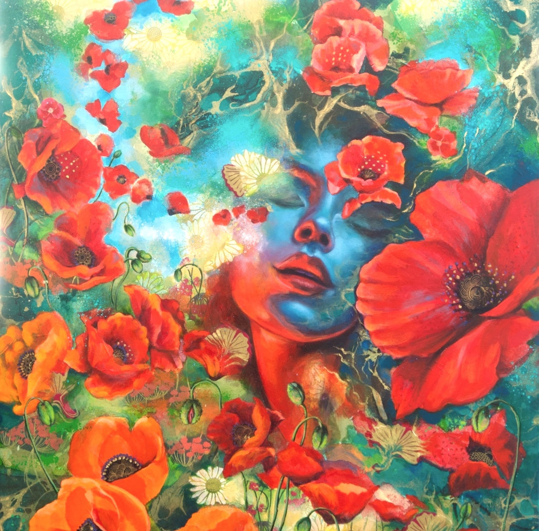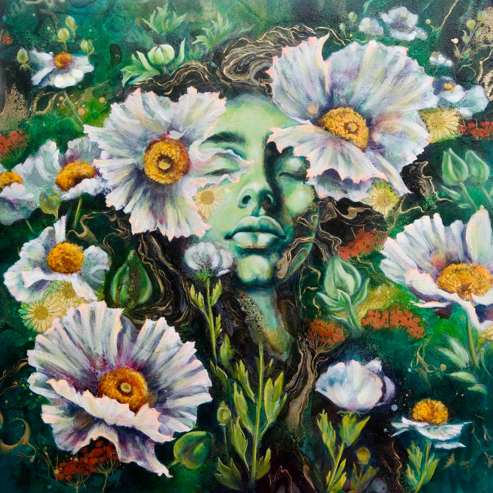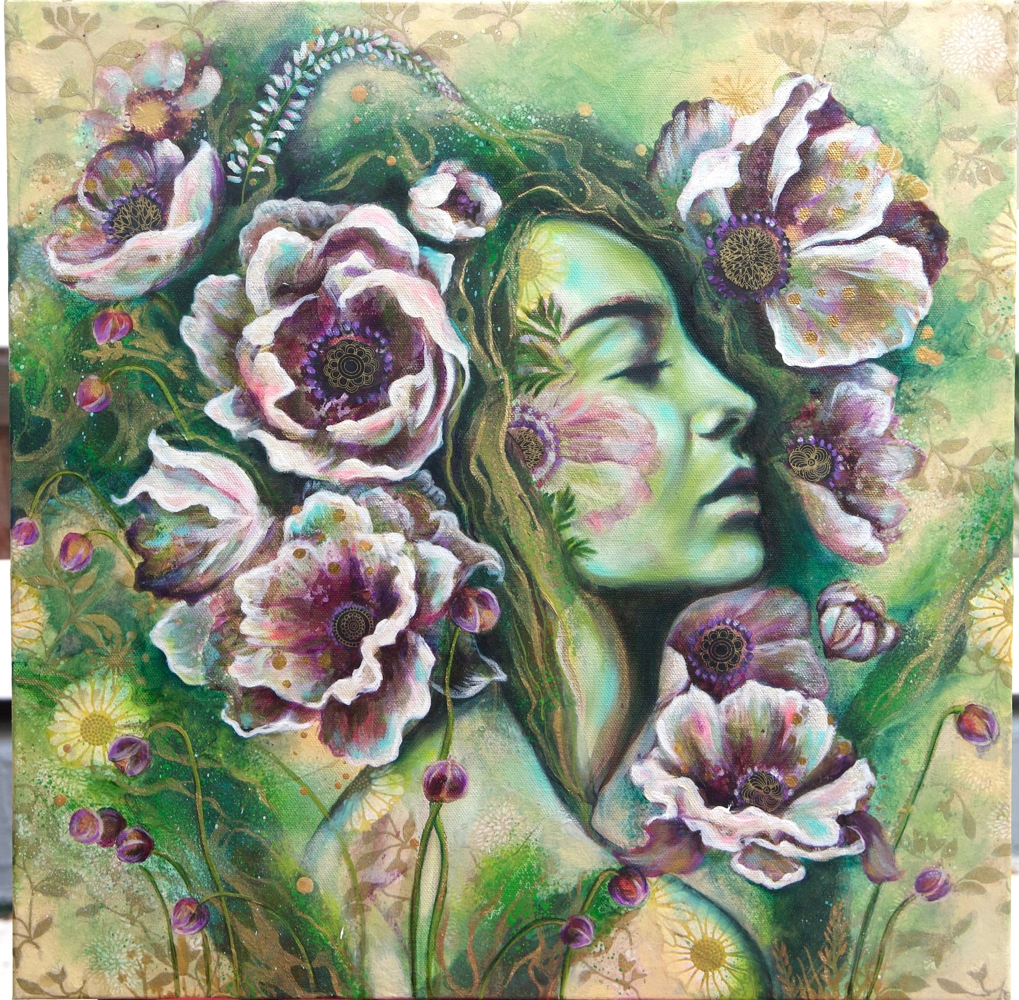 Their inward dreamy expressions, of getting lost and swept away by the blooms, reflect my immersion in my creative practice, of the joy of getting lost in that flow state, where the paint and color and stories are swirling into a stream of being
